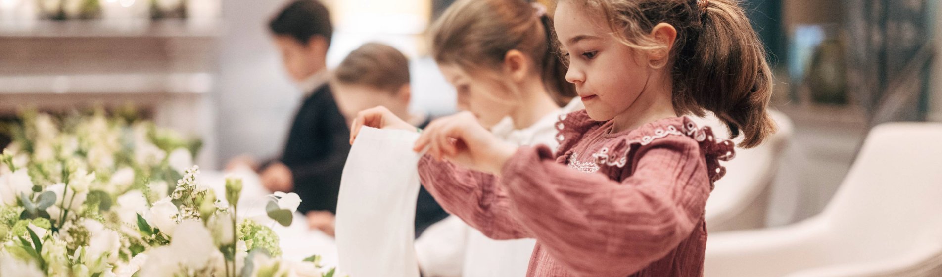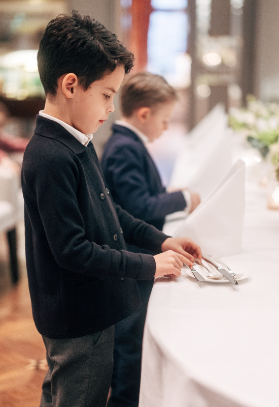The children learn good manners and correct behaviour the fun way as part of an eventful presentation, including how to welcome guests and lay the table, by having an aperitif together and a meal which is well-loved but tricky to eat, such as e.g. spaghetti.
