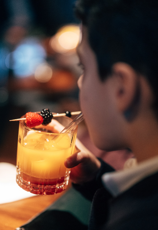 - Alcohol-free cocktail as an aperitif in the bar. Details are covered such as how to hold the glasses and how to eat the fruits in the cocktails.