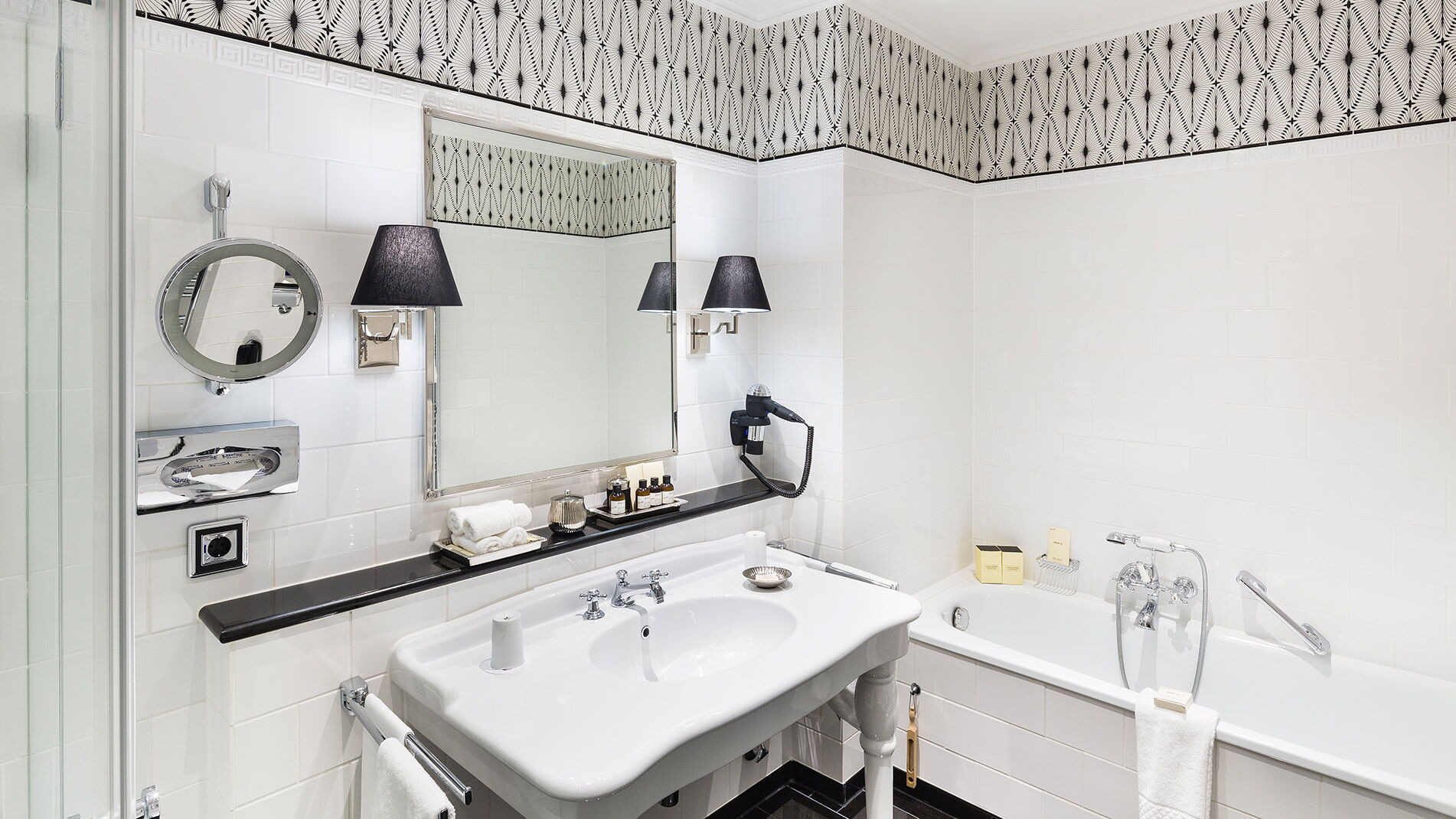 Illuminated make-up mirror, elegant slippers for inside and outside the bathroom, free shoe cleaning service, room safe